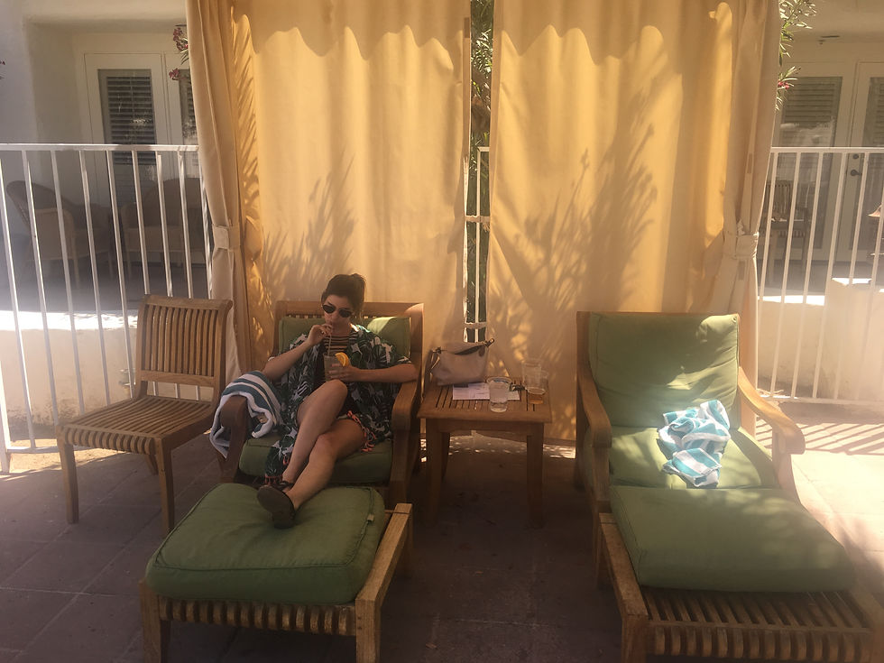 Then I parked myself by the pool for hours, in full lizard mode. Physically and mentally. Here's me settling in, waiting for the cocktail to do it's thang before I stripped off my shawl and jumped in the refreshing pool. I grabbed one of the many little cabana-stlye lounge areas, and seriously, I was the only person at the pool. The whole place has this desert oasis energy.